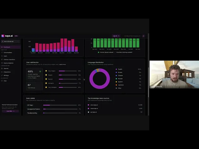 Documentation insights – Identifies weak spots and gaps in documentation from unanswered or frequent questions.